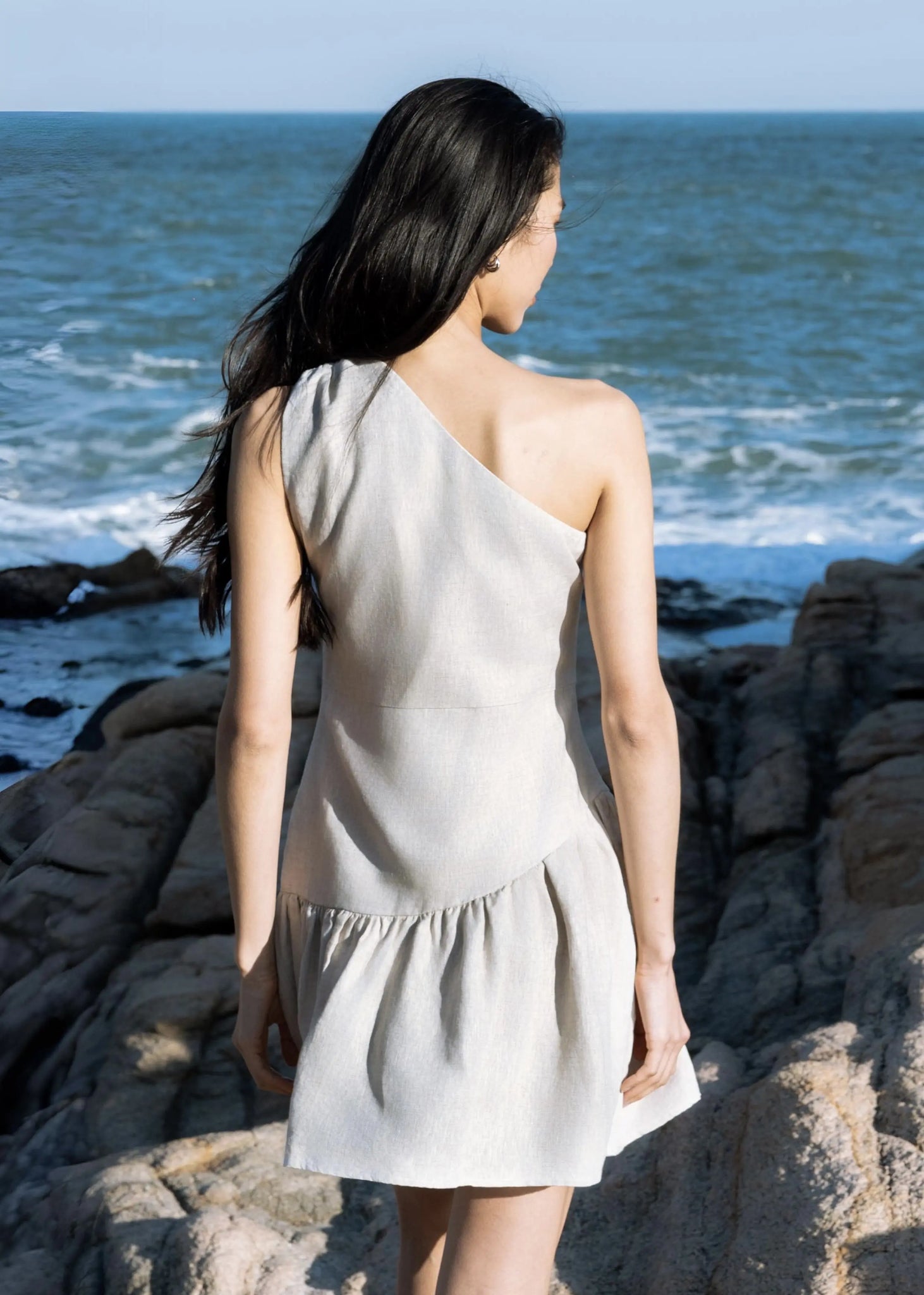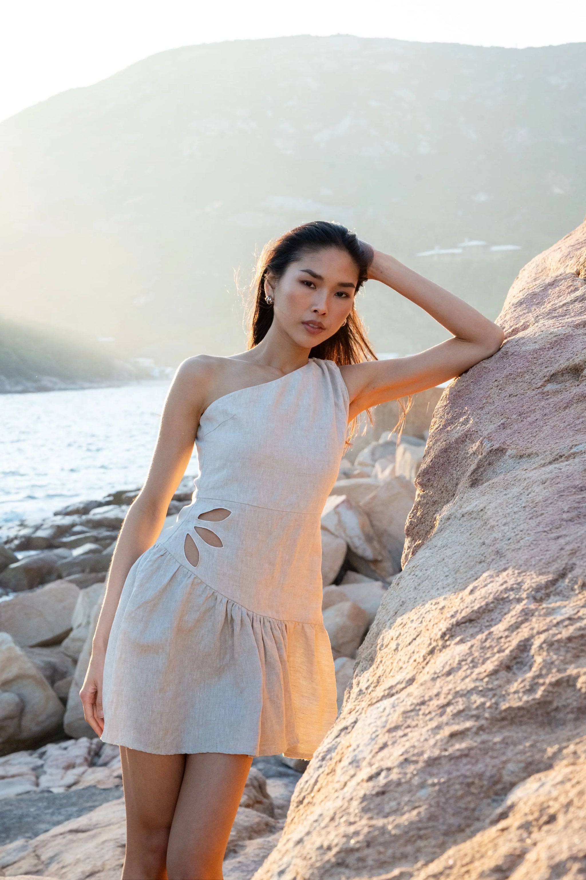 Crafted from natural linen, the Rosie Mini Dress features a one-shoulder design, side petal cut-outs, and a highlighted waist. Rosie is a versatile statement of comfort and style.